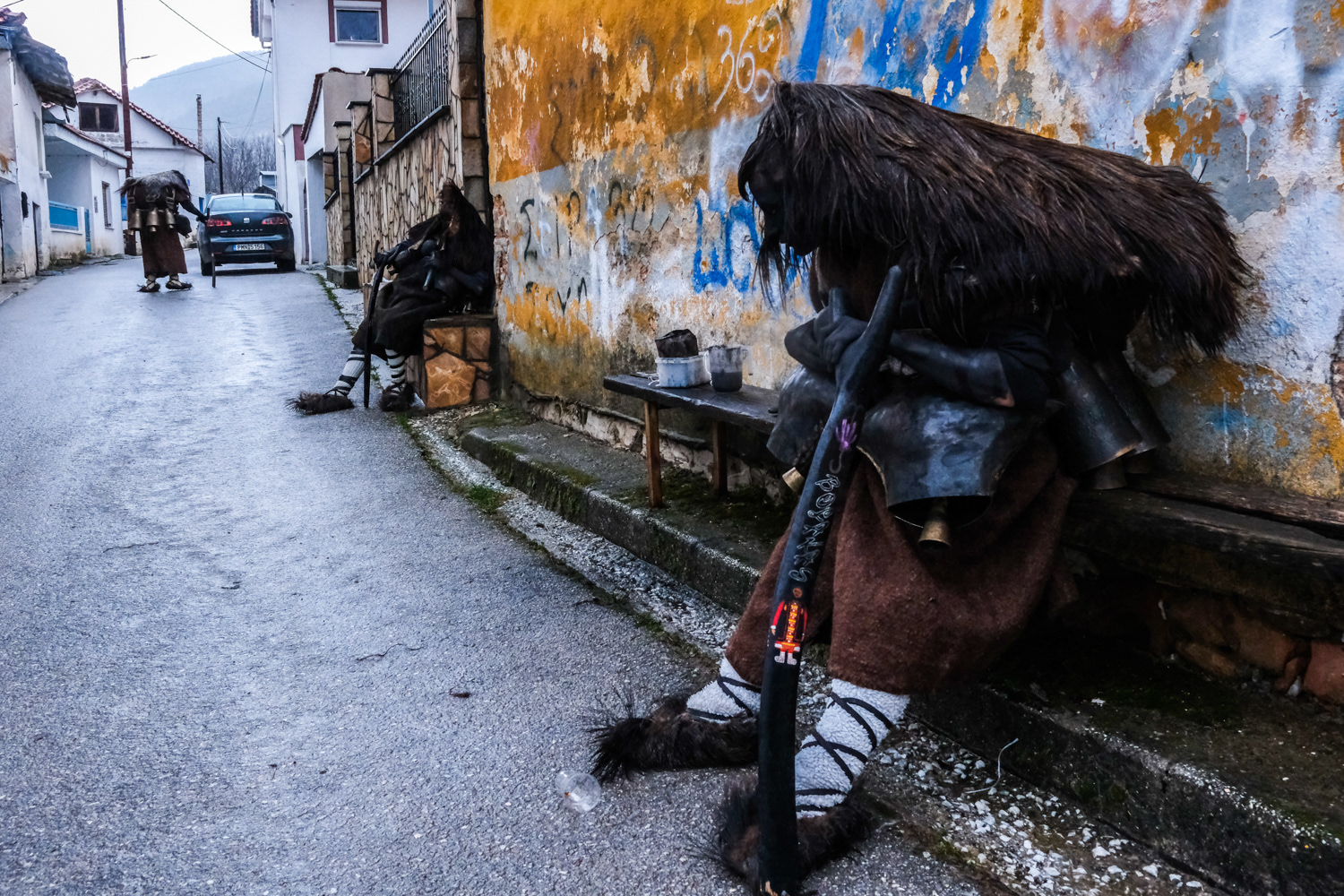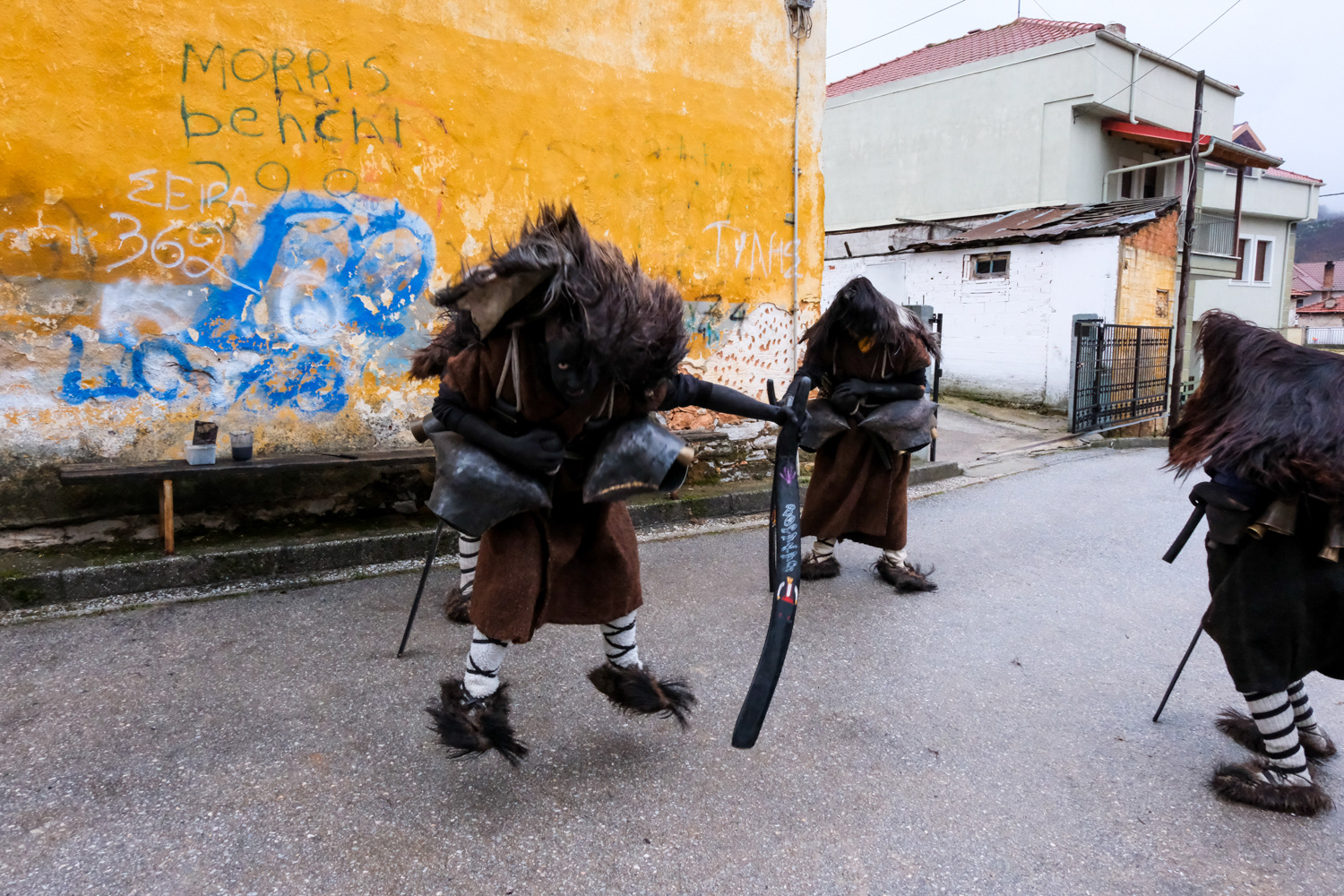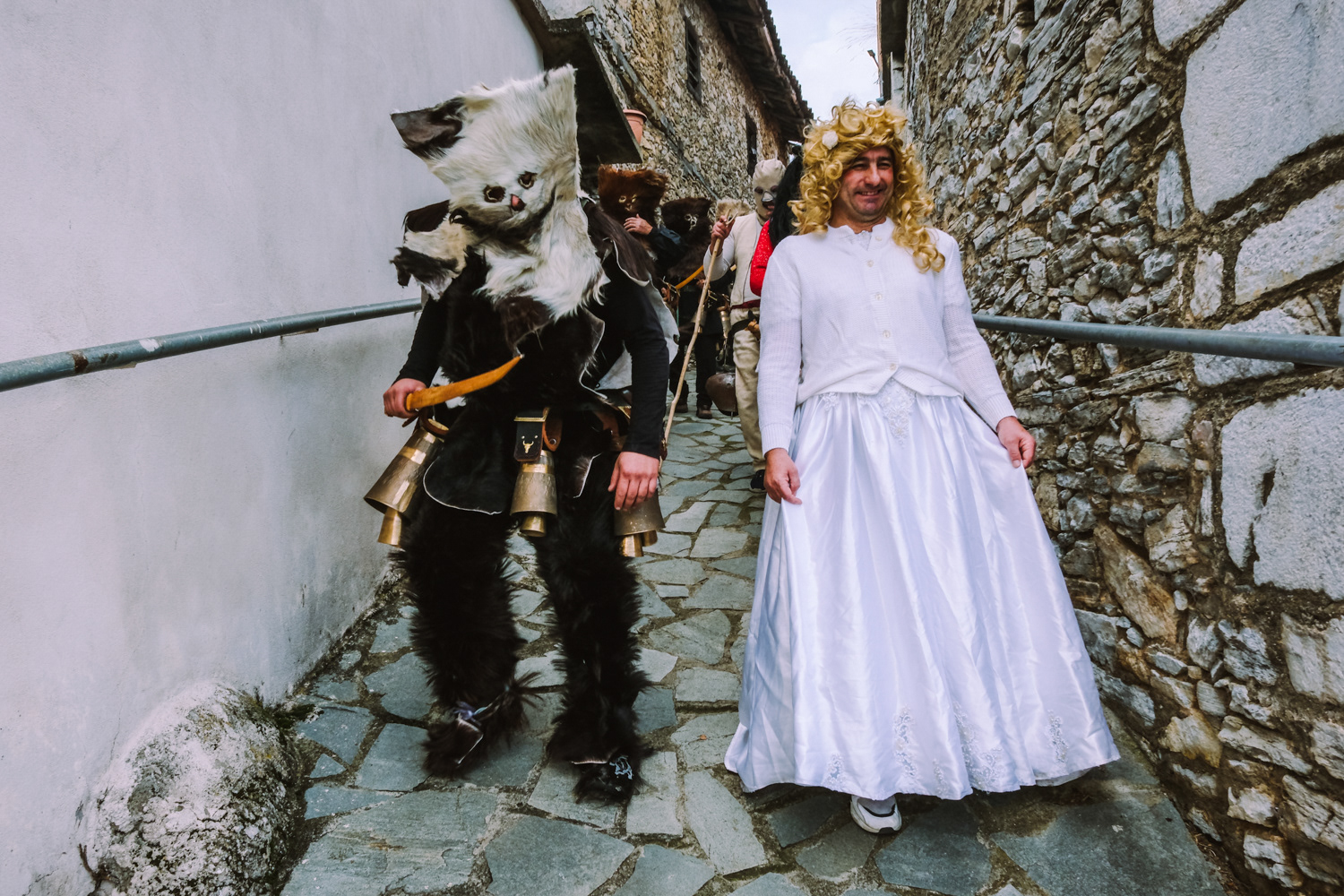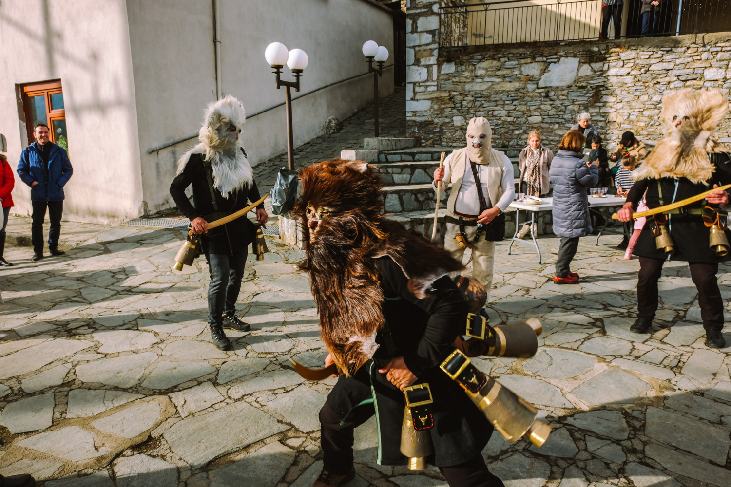 In another settlement, the one of Volakas, the Arapides appear in the streets on January the 7th. The Arapides here have a hump made of straw, bells girded round their waists, their heads are covered with sheepskin, their hands and faces are blackened with smoke, and in their hands they hold a thick wooden stick, on which they lean and sway, giving some rhythm to the sound of the bells. Along with each group of Arapides there is the “chaousis” and the bride, who in their own way give the masquerades the opportunity to shake up and tease the world. More people flock to Volakas to see the custom as it is more widespread in the wider area. Apart from the celebration, it is also impressive to see the preparation of the Arapides, which starts early and it is time-consuming.