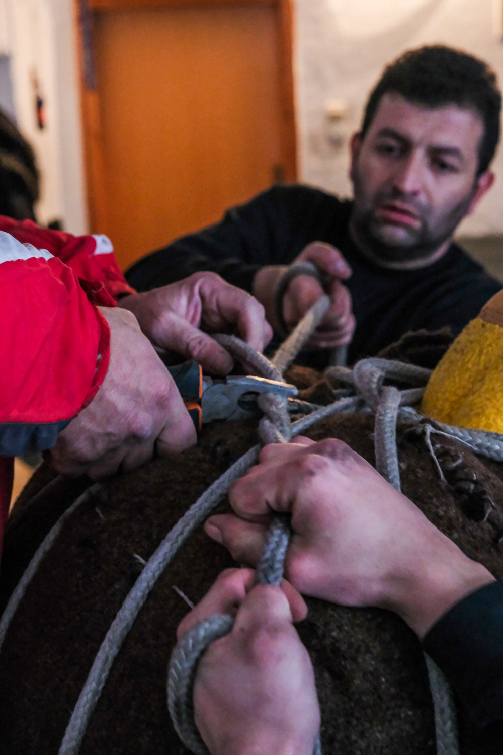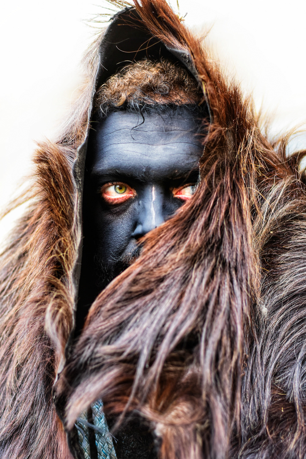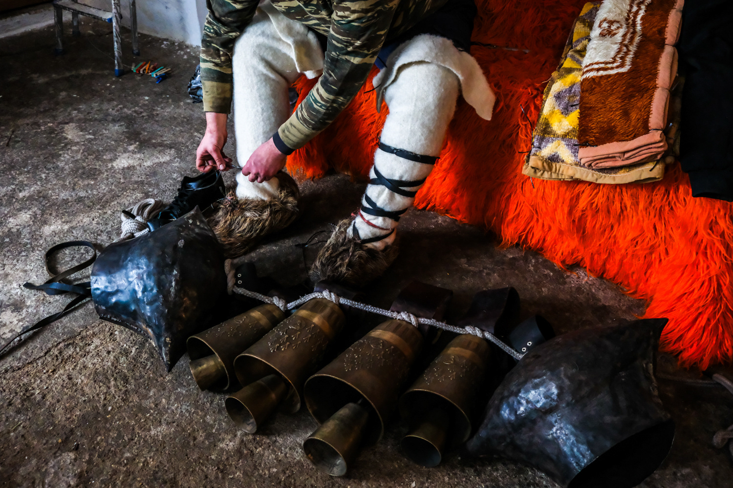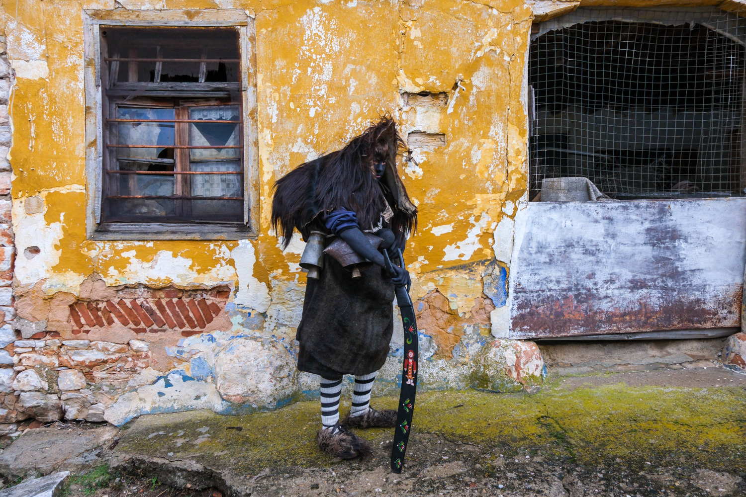 In another settlement, the one of Volakas, the Arapides appear in the streets on January the 7th. The Arapides here have a hump made of straw, bells girded round their waists, their heads are covered with sheepskin, their hands and faces are blackened with smoke, and in their hands they hold a thick wooden stick, on which they lean and sway, giving some rhythm to the sound of the bells. Along with each group of Arapides there is the “chaousis” and the bride, who in their own way give the masquerades the opportunity to shake up and tease the world. More people flock to Volakas to see the custom as it is more widespread in the wider area. Apart from the celebration, it is also impressive to see the preparation of the Arapides, which starts early and it is time-consuming.