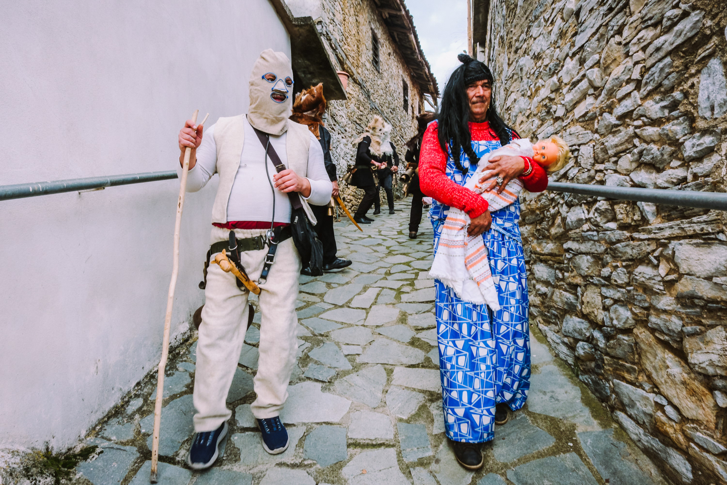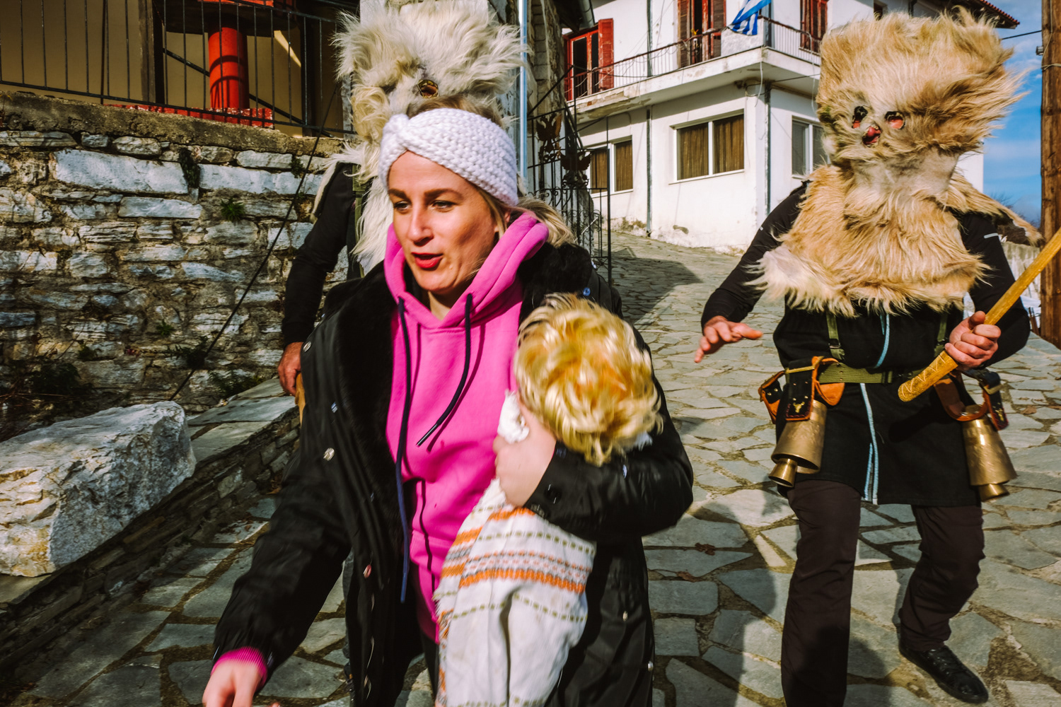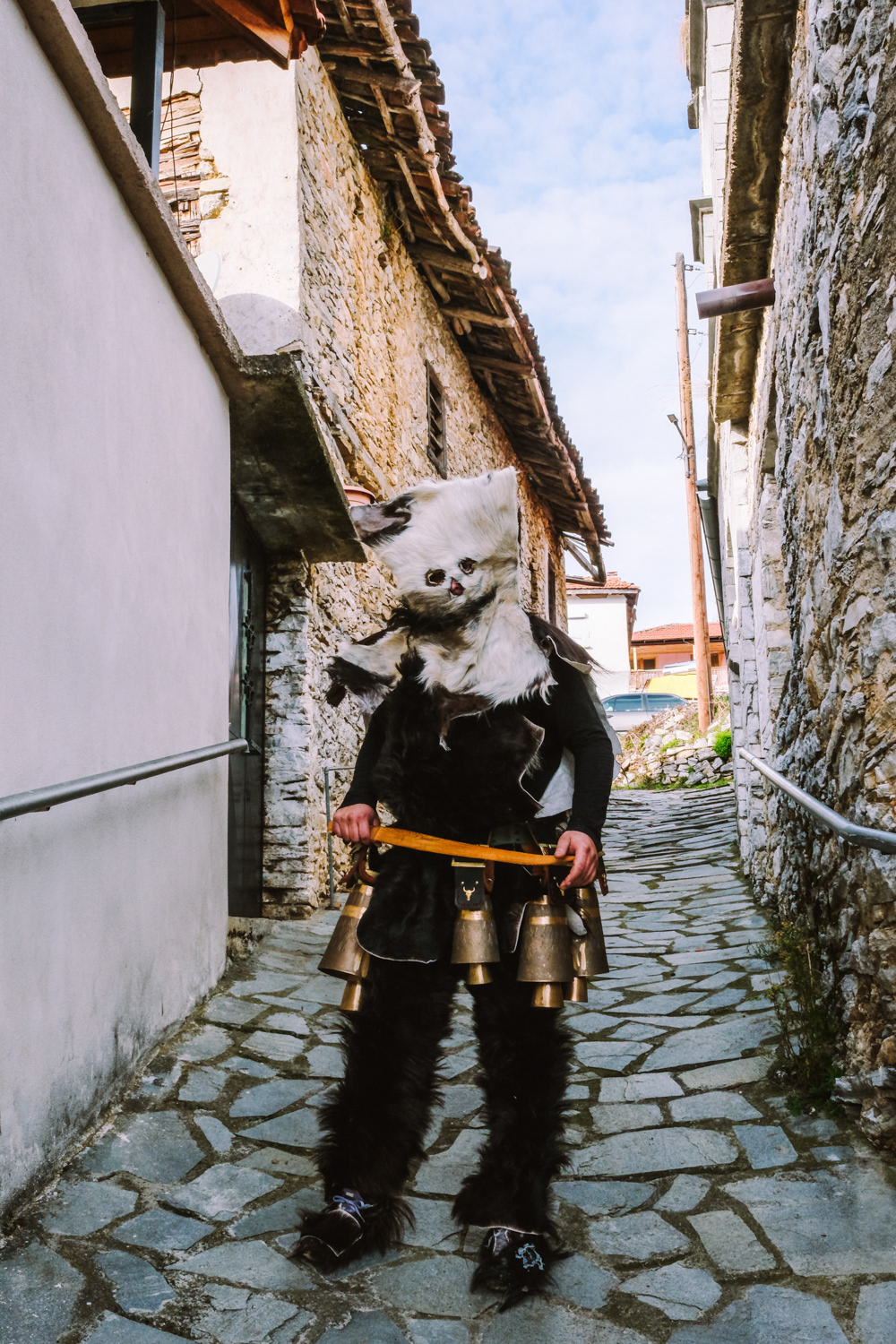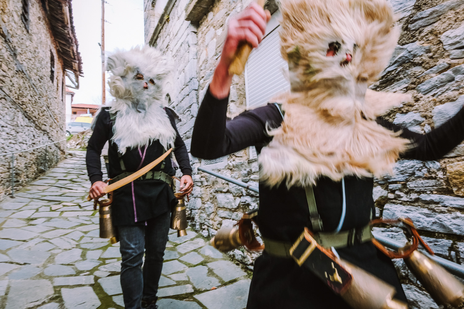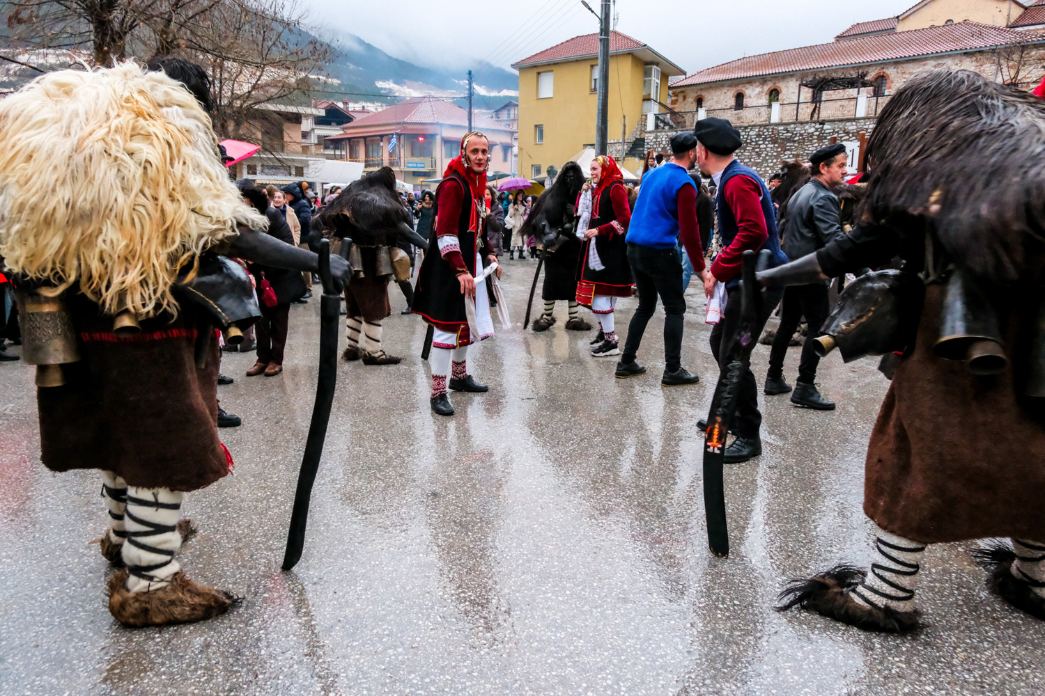 Pagoneri is the most secluded village of all that celebrates the “Arapides” custom. Here the custom kicks off on January 6th and it is called “Harapides”. People wearing scary masks crafted from goat skin, wielding wooden swords, create an atmosphere of excitement. Adding to the spectacle, there are additional characters, including the doctor called “Hatlis” with a pig skin headdress and an outfit which is made of lighter colour fabric, the Bride, portrayed by a man in bridal attire and the Gypsy with her baby. The uniqueness of Pagoneri's celebration lies in the participants portraying sickness or injury, collapsing unexpectedly during the festivities. Hatlis (the doctor), rushes to heal the fallen. Visitors also attempt to playfully "kidnap" the bride or the Gypsy's baby, only to be pursued by the Harapides who are believed to be the bride's brothers.